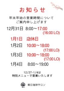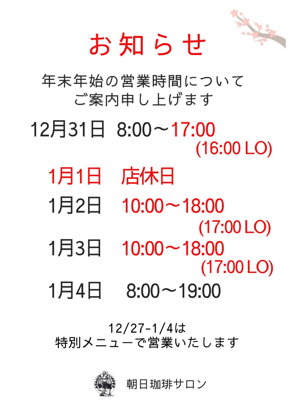 年末は12月31日(水)まで、年始は1月2日(金)からの営業となります。 なお、年末年始は通常と営業時間が異なりますので、ご来店の際はご注意ください。
